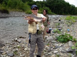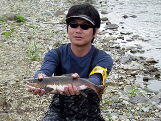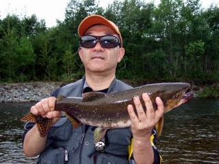 そして最終日です。最後は5人で一緒に釣りをしようということで入ったポイントが大正解。 目を凝らして川の中を見ても魚は見当たらないのですが平本が長年の経験から「ここだ!」と選んだ瀬に入り、それまで沈黙していたH氏がカラフトマスのオス(67cm)をゲット! |