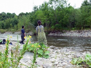 その後、さらに和田さんにHIT!今度はカラフトマスのオスです。さすが、アマチュアながらもバスのトーナメントで好成績を残すだけのことはあります。 しかし和田さん、憧れのカラフトマスのオスのヒットに興奮しすぎてランディングのときに何故か突然川に飛び込みデジカメを水没させてダメにしてしまいました。 興奮した表情がガッカリした表情に変わっていく瞬間が少し切なかったです。。 その間、管理人も「流すタイプ」にてカラフトマスのオスを食わせたもののバラシ。 さらに着水と同時にカラフトマスのメスが食ってきたものの、またしてもバラシ。 忠類川は根掛かりが多く、フックがあまくなったり伸びたりするので根掛かりのたびに注意しないとこういうことになります。 しばらくして平本と合流すると・・・ |