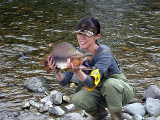 前回は流れに乗せて口を使わせるタイプのRIVETを用意しましたが、今回は再び引っ張って誘うタイプにしました。瀬で使うにはポリカーボネイトのリップだと折れやすいためRIVETでは珍しい金属製のリップです。 平本は特別に和田さんとH氏にもサーモン用のRIVETを2本ずつプレゼントしていました。 さて、いよいよ到着。初日は時間が少ないので魚探しです。今回は、さらに川の流れが変わっていました。 前回までは第一管理棟から150メートルも歩けば川があり、ミノーを引くには絶好のポイントだったのですが肝心の川が見当たりません。 そこから100メートル以上先でしょうか。ようやく川が見つかりました。 先ずは毎年魚がたまる忠類橋の少し上にある淵の様子を見に行きましたが魚が見当たりません。 しかたがないので川を遡りながら魚を探してみましたが、数尾確認したのみで終了となりました。 翌日は平本とH氏が下流に入り、管理人と管理人奥さん、和田さんの3人は上流に入りました。 自転車で上の方まで行き、歩きながら下ってみるとようやくカラフトマスの居る瀬が見つかりました。 少しすると和田さんにHIT! カラフトマスのメスが釣れました。 |