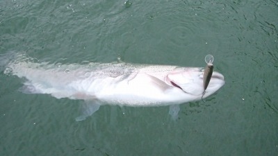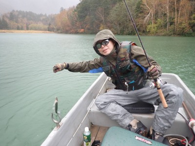 お世話になります。埼玉のNです。 今シーズン最後となるでしょう釣行に行ってきました。 天気予報で終日雨か、曇りという雨前提で前々日がマイナス1度という苦行を覚悟していってきました。 7:30、ややゆっくりエレキなど準備して出船して、他の人たちはさっさと出ていましたが、大方がフライのようでした。 先日の台風の影響で増水、風に雨が吹き付ける状況。2時間くらいは風裏など見て回りましたがなにもなし。 隣の沼に移動して、バスのように岸際の倒木にキャストして、一度のアクションでイキナリ、ドーンとデカいのがかかりましたが、 どうやってあげるかなど考えながら、ためていたらばらしてしまいました。 その後、雨が上がり日が差すなど、ありましたが、鱒の反応はほとんどなく、一度、チェイスがあったのみで時が過ぎ、 13時にカップ麺タイムを迎え、またもや降り始め、つらい中(温度はそこまで低くなりませんでした)キャストを繰り返しました。 そして、船着き場にゆっくり戻りながら、あきらめ悪くキャストして、残り50分のところでチビマスがかかり、ようやくボウズを逃れ、 その次にキャストして画像の50オーバーをえました。かなりのファイターでドラグを出して、ノシノシでした。 |